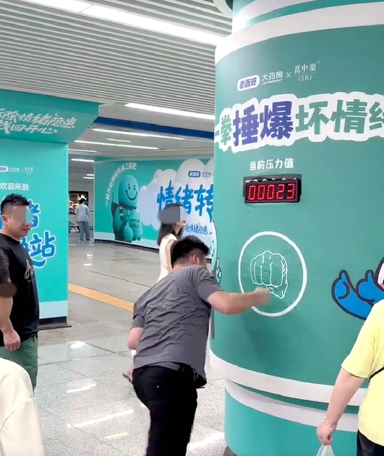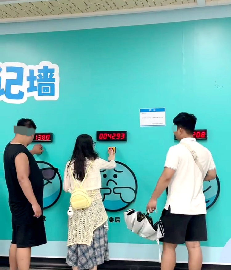 近日,有游客拍摄视频称,在湖南长沙旅游时,偶然发现迎宾路口地铁站设置了多面解压墙:有的墙名为“一拳锤爆坏情绪”,设置了一个区域供旅客打拳解压;有的墙名为“心情日记”,让旅客按按钮选择当时心情(委屈、愤怒、超开心等);还有的墙名为“别烦啦!抱抱你”,游客可以抱墙上的玩偶……可能是体验拳击的人比较多,有旅客发图称,供人拳击的解压墙被“打坏了”。
